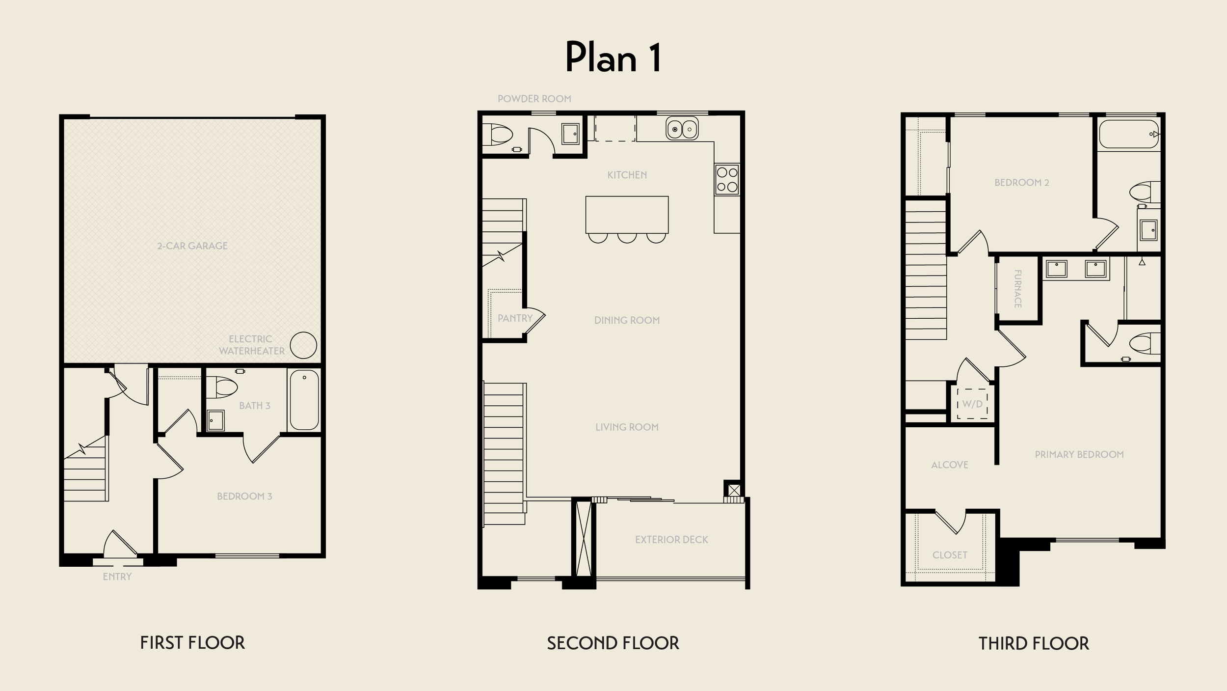 Plan One is a 1,691 sq. ft. three-level townhome designed for flexibility and retreat. A bedroom on the main level offers privacy for guests or multigenerational living, while two additional bedrooms occupy the third floor. The primary suite features a private alcove—an intimate den for quiet moments. An exterior deck off the second-level open living area creates a seamless indoor-outdoor flow. Complete with a two-car garage and three-and-a-half baths.