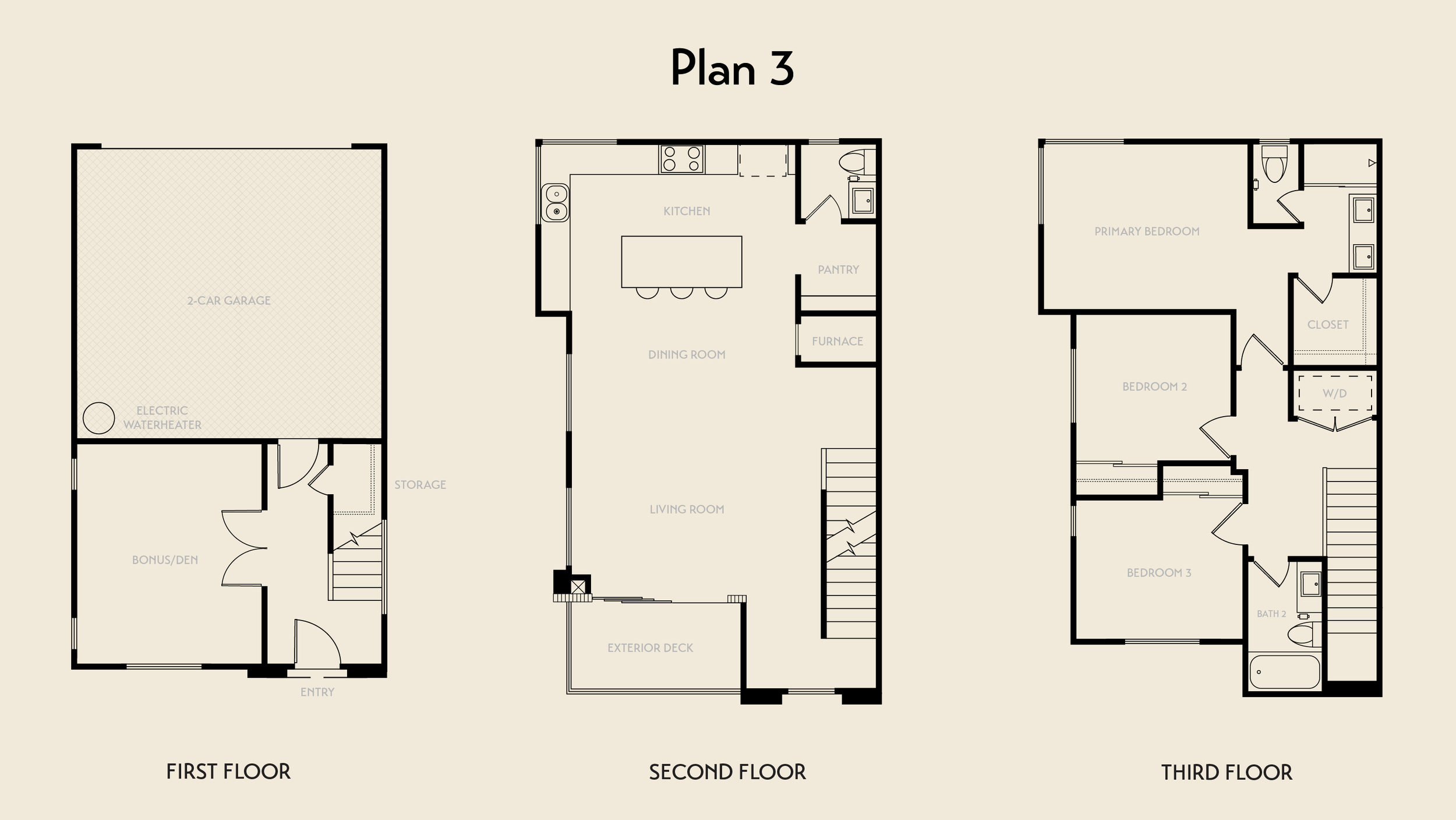Plan Three is a 1,756 sq. ft. three-level townhome designed for effortless everyday living. All three bedrooms are privately situated on the third floor, while the first level features a versatile den—ideal for a home office or studio. The second-floor living area opens to an exterior deck for relaxed indoor-outdoor living, complemented by a spacious kitchen with an extended pantry. Includes a two-car garage.